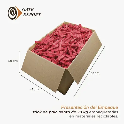 El palo santo sangre de dragón para exportación se adapta eficientemente a operaciones logísticas por vía aérea o marítima, facilitando el almacenamiento, manipulación y distribución en destino.